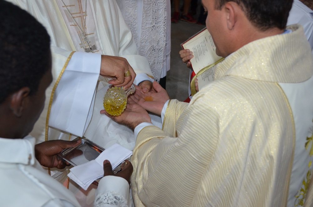 Ao termino, os diáconos se ajoelharam novamente diante o bispo e, em silêncio, o Bispo com as mãos impostas sobre as suas cabeças, fez a Prece de Ordenação. Ao ficarem de pé, os dois eleitos foram revestidos com os paramentos sacerdotais, sinais de serviço ao povo que lhes será confiado. Logo após, os dois candidatos teve as mãos ungidas com o Óleo do Crisma, atualizando assim, a unção que Cristo recebeu de Deus com o Espírito Santo.