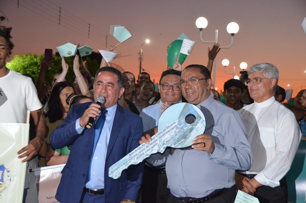 Durante a acolhida, o Padre Antônio Cristo de Oliveira recebeu das mãos do Prefeito Eudes Agripino Ribeiro, a chave simbólica da cidade.