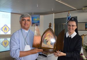 Após a reflexão, a assembleia acolheu a Ir. Kassiana do Movimento Apostólico de Schoenstatt. A religiosa abordou o objetivo da Campanha da Mãe Peregrina de Schoenstatt, no que consiste a Campanha e como a mesma pode ser realizada. “Trata-se de um apostolado eclesial que deseja colaborar com a pastoral ordinária das dioceses e paróquias. É um apostolado popular, que procura chegar a todas as pessoas em todas as situações da vida, realizando o mandato do Senhor”. Por fim, presenteou o Bispo, Dom Plínio José Luz da Silva, com uma capelinha da Mãe Peregrina.